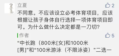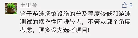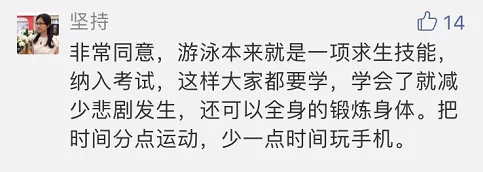 对于游泳纳入中考体育必考选项,家长们的看法不一。支持者认为,“游泳本来就是一项求生技能,纳入考试,孩子们都要学习,除了锻炼身体,还能减少意外的发生。”也有人认为“很多学校都没有开设游泳课,学习硬件设施跟不上也白搭。”反对者则认为,“游泳实际生活中使用频率极低,并不能作为普适性健身运动,纳入选考更合适”“学校的硬件设施跟不上,课外游泳培训费伤不起。”