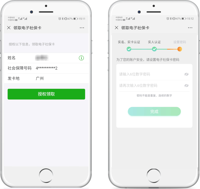 根据提示授权领取电子社保卡,并进行实人实名认证后,设置电子社保卡密码,即可完成领取。