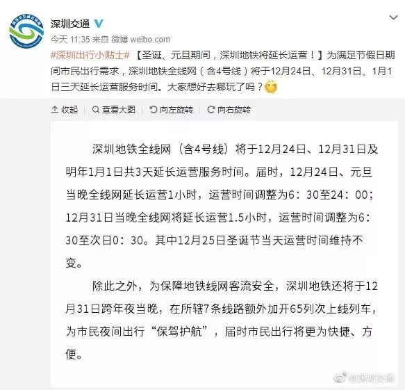 12月31日延长运营1.5小时(11号线约1小时),至次日0时30分。