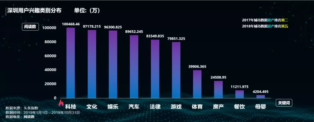 今年深圳网友对科技最感兴趣,文化次之。房产排名连续两年下滑,2017年排名第二,2018年跌至第五,而今年降至第八。