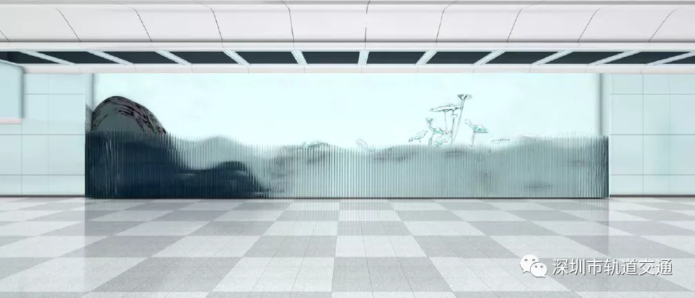 该站的文化艺术墙采用钢化玻璃和不锈钢喷漆,通过材质的特性,呈现出自然变化的形态,不同环境下不同的形态美。