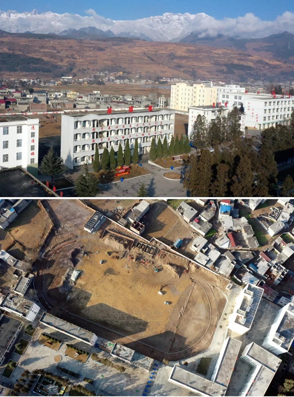 1月22日,上图是巫其拉布木就读的越西县新民中学;下图是该校正在建设的足球场。李思佳 摄