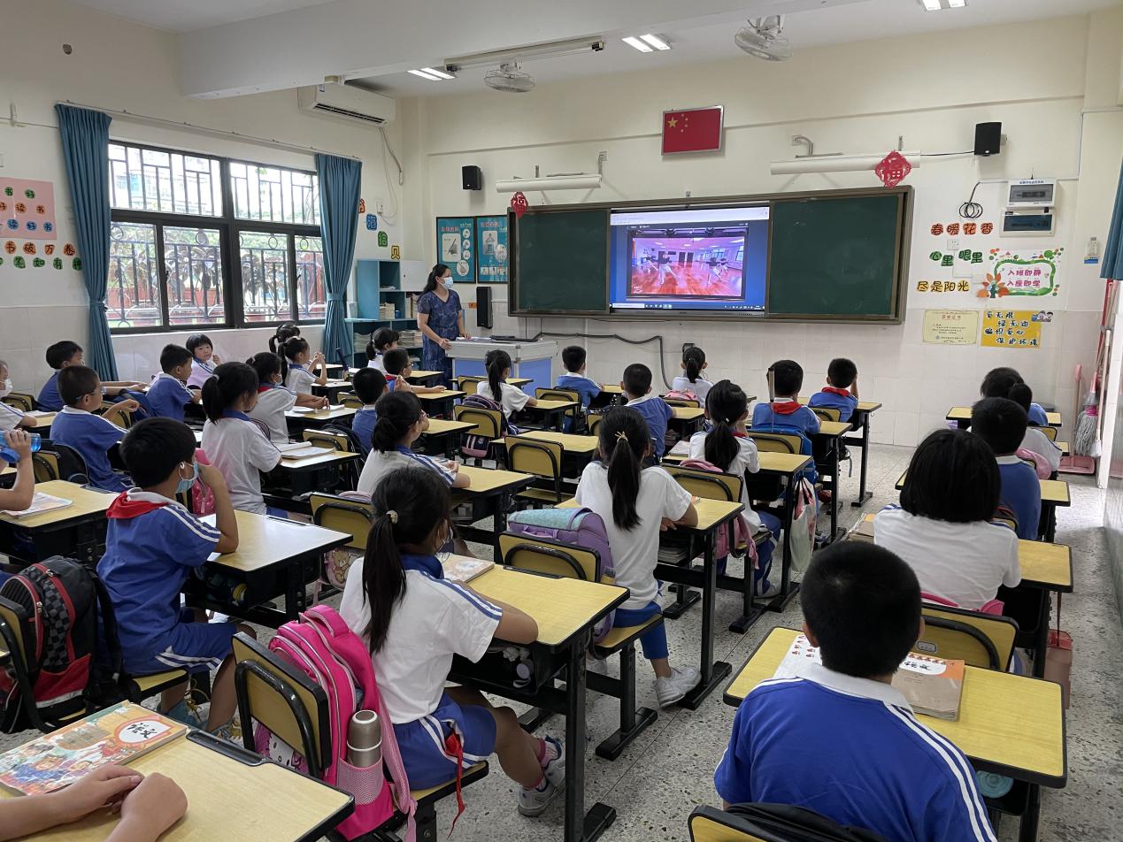 学生在教室通过线上的形式观看“六一文艺庆祝活动”直播