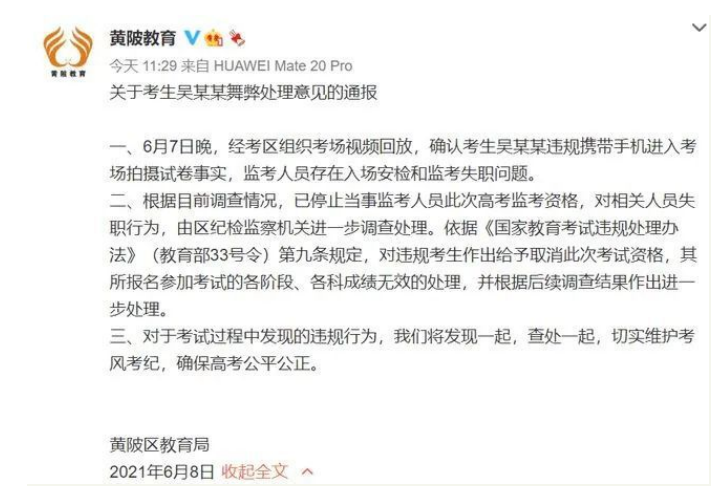 读特客户端.深圳新闻网2021年6月18日讯(记者张玲童小晋实习生翁任莹)又是一年考试季,几起考试作弊新闻,令人震惊:6月5日,江西省举行的2021年普通高校专升本考试出现统考科目疑似泄题事件,151名考生作弊,多名教师被刑拘,引发全网关注。6月7日,湖北武汉高考考生吴某某携带手机进入考场,拍摄考题上传网络,被取消全部考试成绩。6月11日,山东52人高考作弊被抓,单科高考成绩全部被取消。