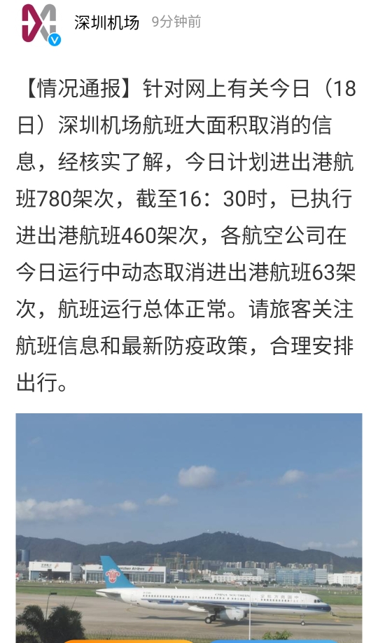 读特客户端·深圳新闻网2021年6月18日讯(记者 张玲 罗嘉欣)6月18日17时许,深圳机场通过官网微博发布深圳机场航班进出港情况。通报中指:针对网上有关今日(18日)深圳机场航班大面积取消的信息,经核实了解,今日计划进出港航班780架次,截至16:30时,已执行进出港航班460架次,各航空公司在今日运行中动态取消进出港航班63架次,航班运行总体正常。请旅客关注航班信息和最新防疫政策,合理安排出行。