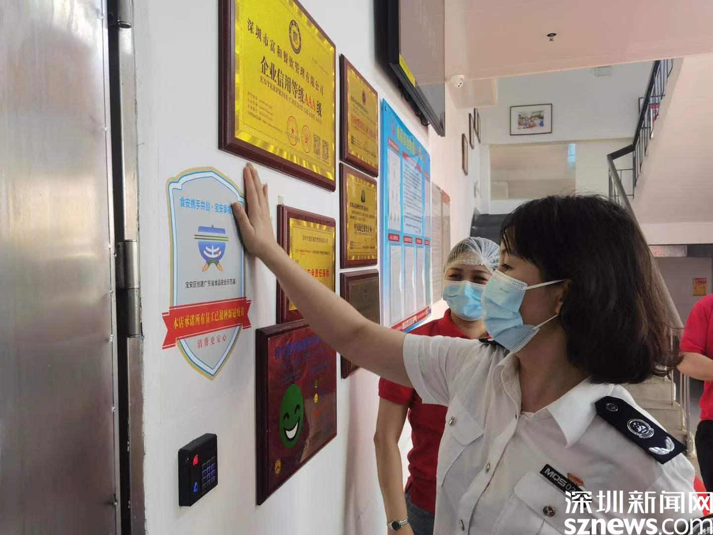 该企业占地4600平方米,近百名员工,每天出餐约16000份左右,是宝安区是较大规模的配餐中心。企业入口处即食品安全信息公示栏。执法人员现场检查了经营许可证等证照、员工健康证、执法部门检查等信息,显眼位置公示了企业的食品安全要求、张贴了食品安全应急措施等规章制度,对企业索证索票进行检查后,执法人员表示规章规范较为完备,并要求要做好员工培训、食品安全演练等工作。