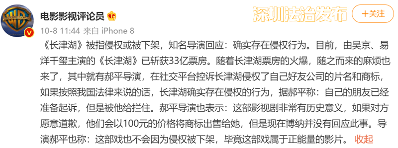 读特客户端.深圳新闻网2021年10月13日讯(记者 翁任莹 张玲 童小晋)近日,电影《长津湖》被指侵权了一部纪录片的片名和商标。无独有偶,前段时间,全红婵等多位奥运冠军的名字也被多方抢注,被国家知识产权局驳回注册申请,并公布和处罚了恶意抢注的申请人和机构名单。