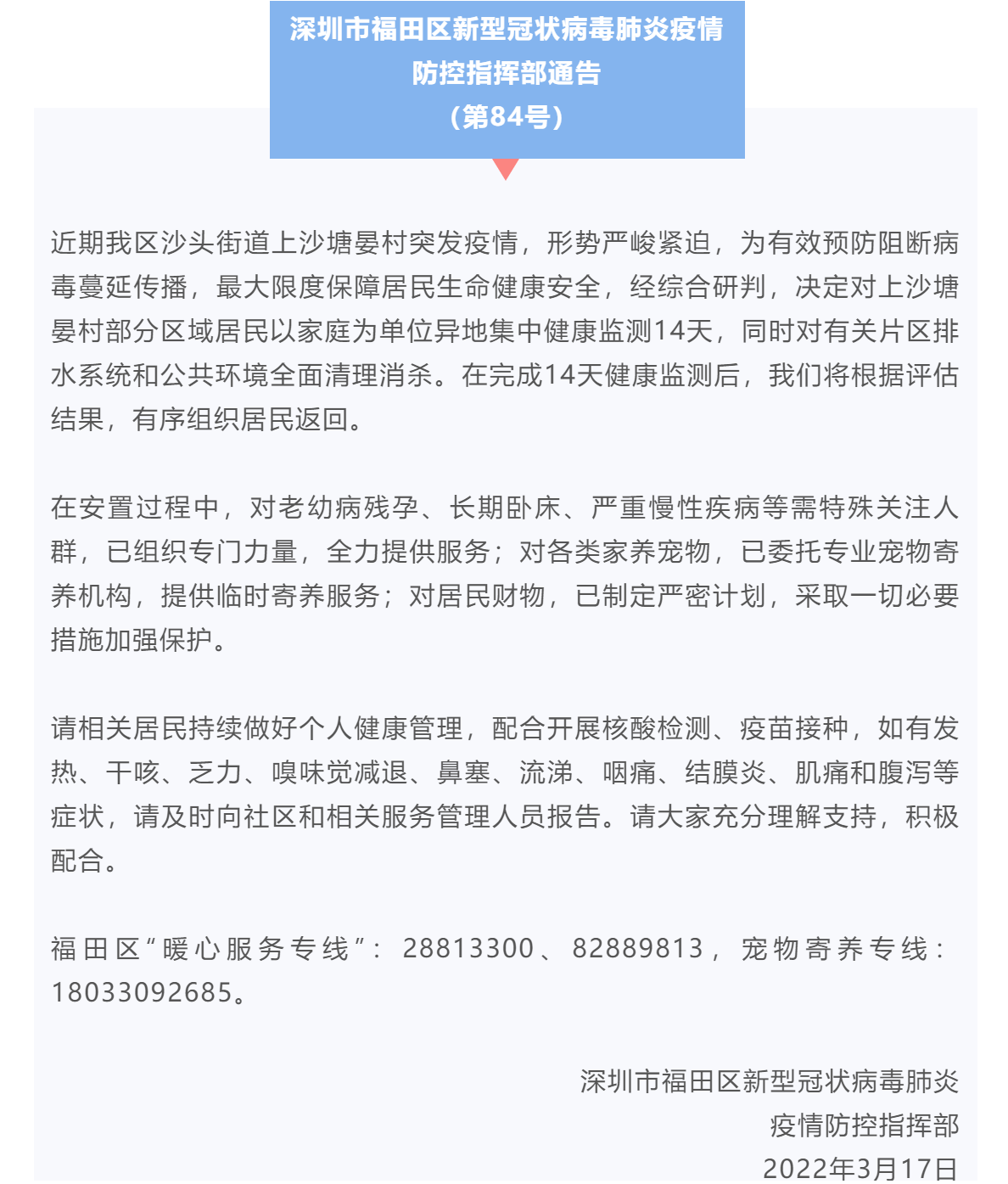 福田区发布第84号通告:已委托专业宠物寄养机构提供临时寄养服务。