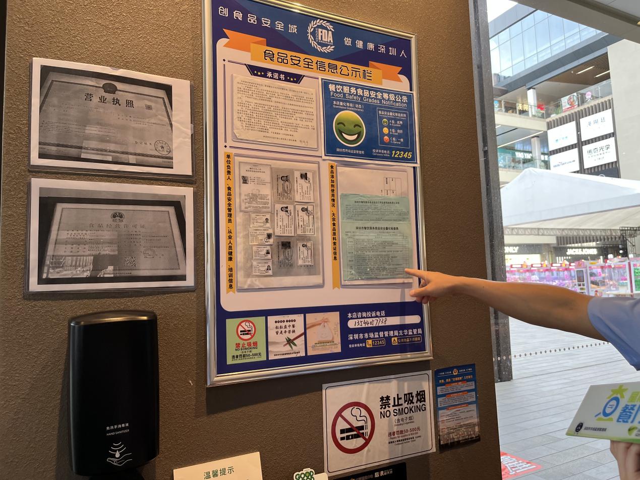 根据疫情防控需要,在扫码测温后,执法人员一行进入奈雪的茶,来到食品安全信息公示栏。记者在现场看到,目前该茶饮店食品量化等级为B级。执法人员表示,该茶饮店的信息公示较完善。