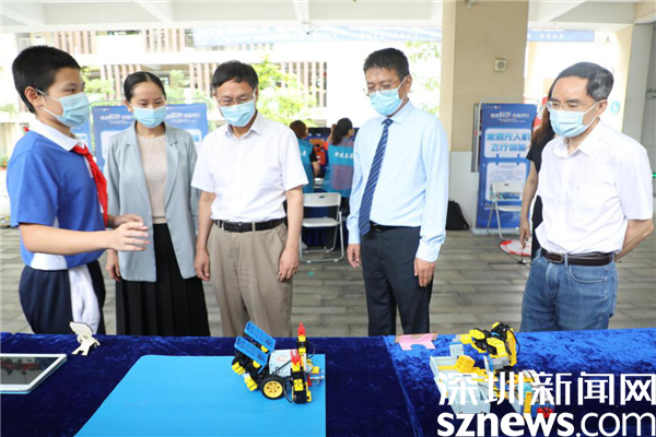 此外,活动现场还设置科创作品展示区和人工智能体验区。张学记和现场嘉宾参观了学生创客作品展,对智能分拣机、变形机器人、智能教室等作品予以了肯定。同学们在老师带领下,有序参加了意念爆米花、意念无人机、bit模型火箭车比赛、智能机器人体验、AI编程机器人等科技体验项目,不时地发出欢呼和惊叹的声音,感受到人工智能的魅力。