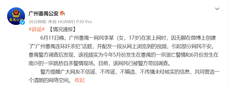 6月11日晚,广州番禺一网民李某(女,17岁)在家上网时,因无聊在微博上创建了“广州番禺连环奸杀犯”话题,并配发一段从网上浏览到的视频,引起部分网民不安。番禺警方调查后发现,该视频实为今年5月份发生在番禺的一宗溺亡警情和6月份发生在南沙的一宗跳桥自杀警情现场。目前,该网民已被警方带回调查。