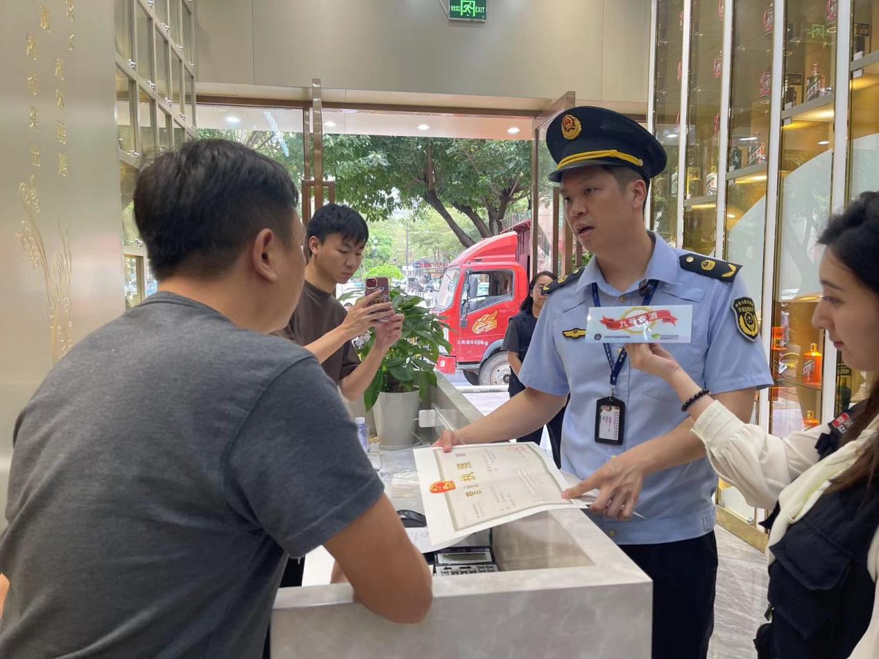 深圳新闻网2023年11月9日讯(记者 胡津玮 翁瑞峰 牛耘)11月9日,深圳市市场监督管理局联合深圳新闻网举行2023年“九号查酒”第八期行动,突查了福田区的茅台馆酒行和国匠行烟酒名店。经检查发现,茅台馆酒行在门头牌匾及室内装潢存在商标侵权的情况;而在国匠行烟酒名店执法人员则发现该店有售卖假冒的贵州茅台酒。执法人员按程序对涉嫌违法酒类进行暂扣,目前在进一步调查。