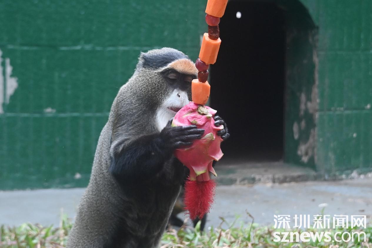 除了吃“汤圆大餐”,动物们还活跃玩起了“花灯”。动物园饲养员用火龙果、提子、红枣、香蕉、红萝卜等食物为红尾长尾猴和德氏长尾猴制作了“水果花灯”,其中的“灯笼穗子”采用了红千层花。长尾猴对新奇又喜庆的“花灯”爱不释手。