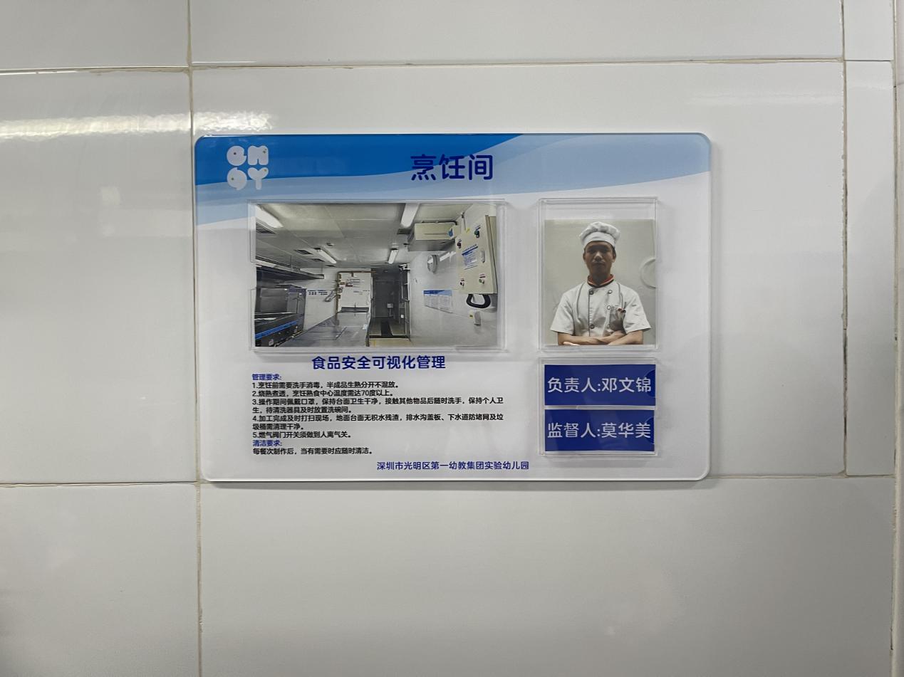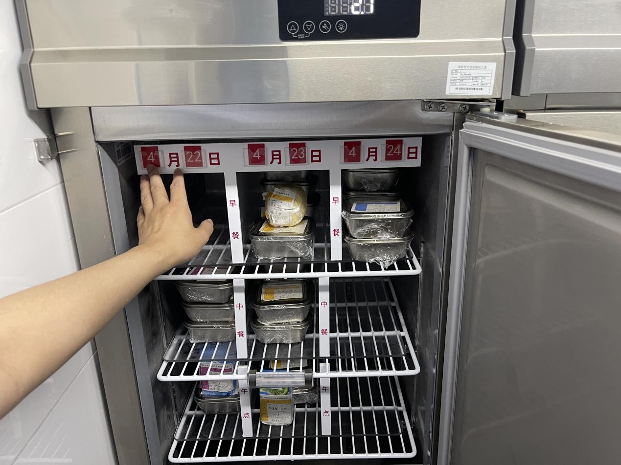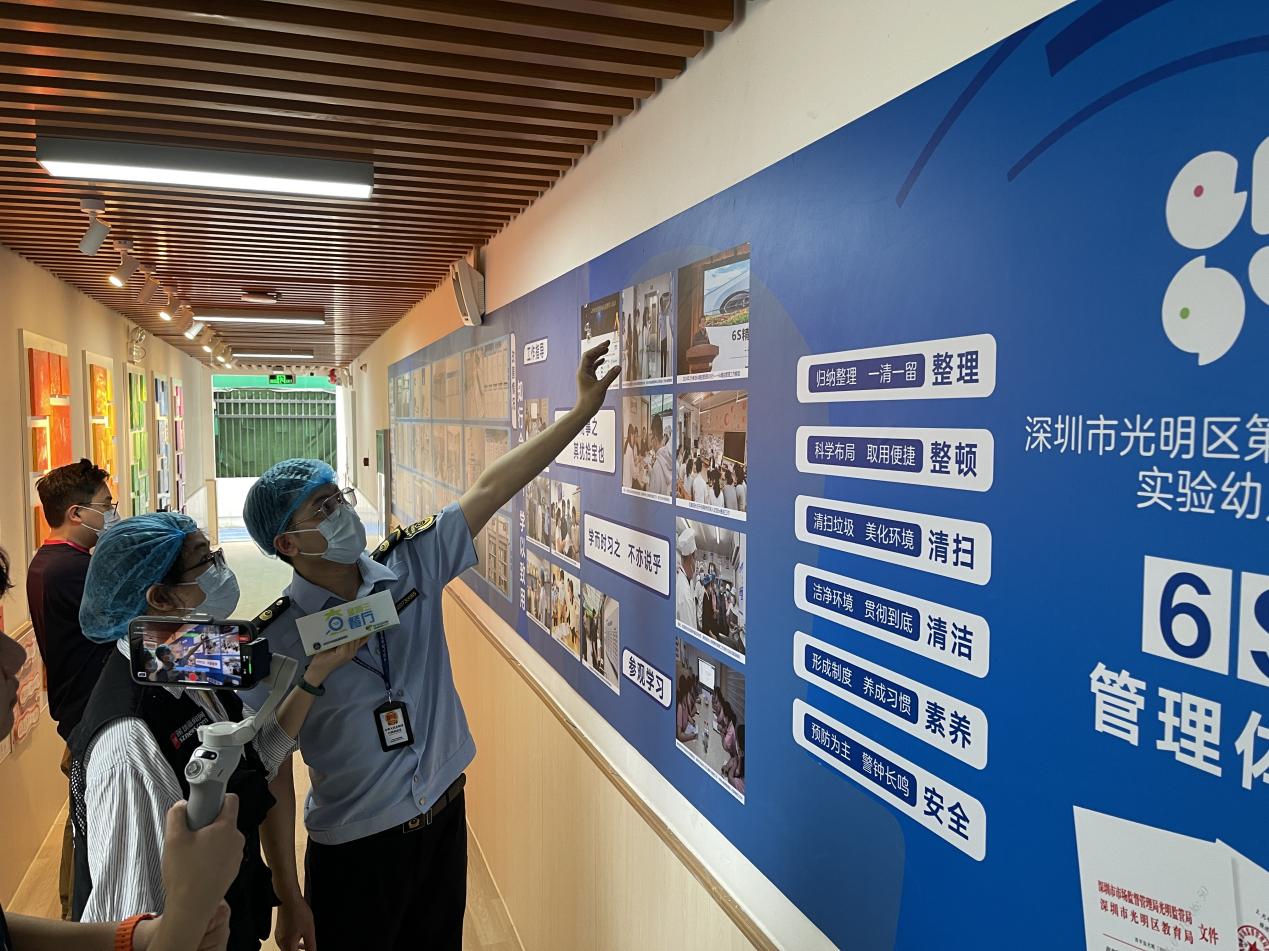 陈泽楠介绍,深圳市市场监管局光明监管局与光明区教育局合作,联合实施了“光明区校园A级食堂‘焕颜迭代’计划”,在光明区40所学校食堂实行6S精细化管理体系,即整理、整顿、清扫、清洁、素养、安全,由市场监管局执法人员对各学校管理人员进行培训,让校园食堂管理人员深入了解6S管理要领,并对日常校园食堂管理进行系统化改善、升级。“本次行动来到的光明实验幼儿园食堂就是按照6S管理体系建设的样板示范学校,刚刚在后厨看到的色标管理、食品安全可视化管理标签、留样冰箱分格等都是这套体系的具体体现,虽然学校已经建成超过十年,但食堂内部管理、维护依然十分到位,再加上6S管理体系的辅助,相信孩子们的校园食品安全能得到充分保障。”陈泽楠说道。