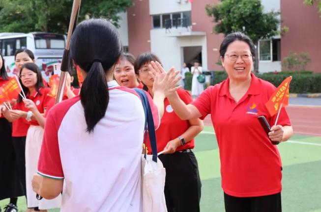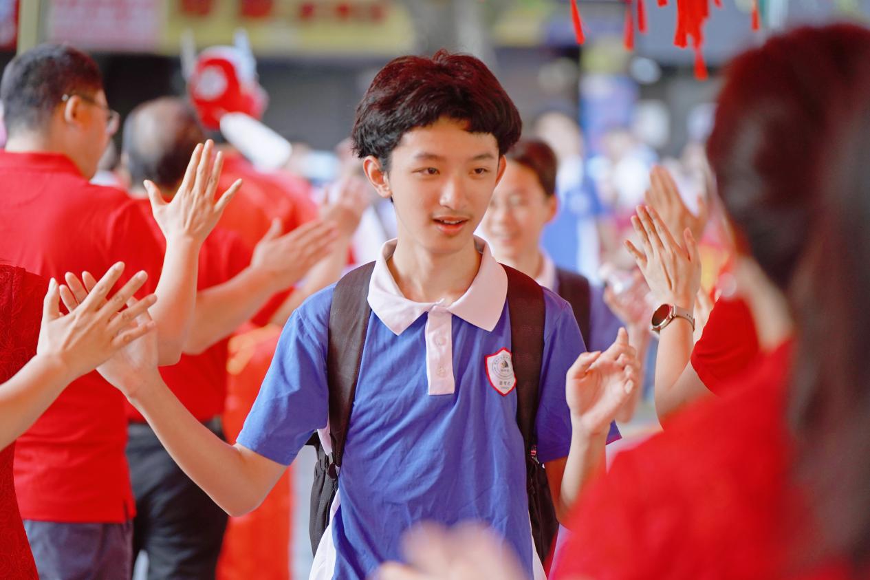 在深圳中学梅香学校外,老师列队与考生击掌,喊口号加油。