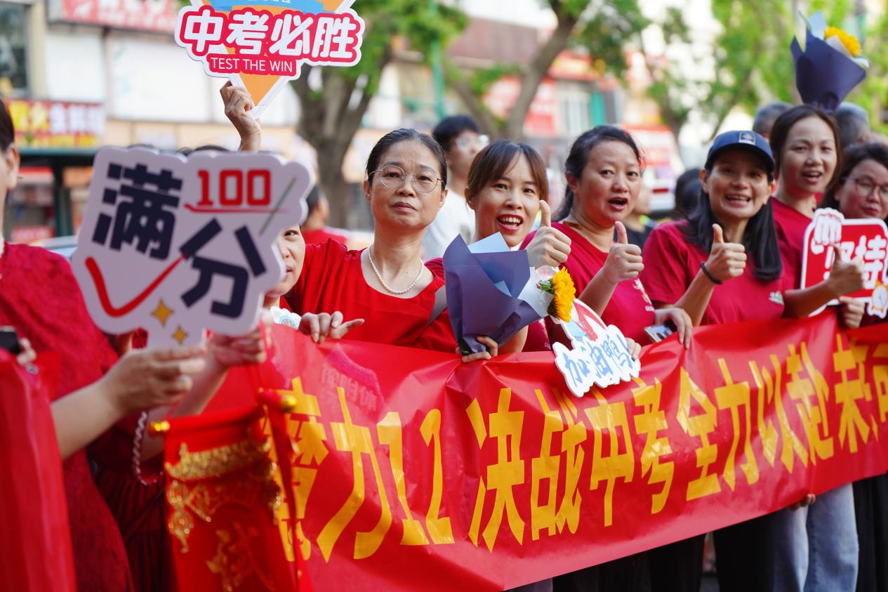 家长身穿写着“中考加油”“乘风破浪,勇攀高峰”的红色上衣,为考生加油助威。
