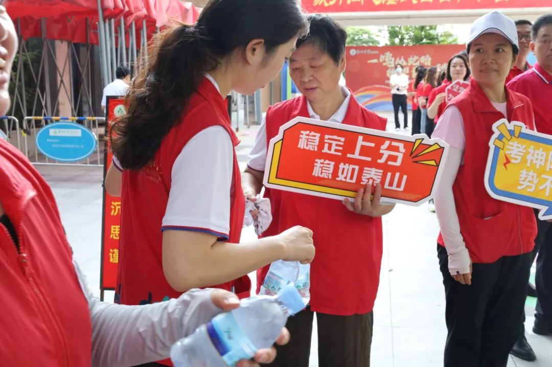 炎炎夏日,梅林义工为考点外等候的家长和工作人员送水。