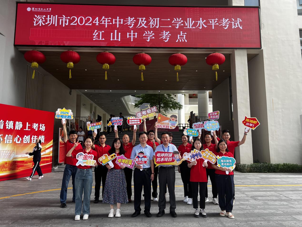 红山中学迎来了其首届中考的第一天。清晨,学校领导和全体教师早早到场,他们在考场入口处为每位考生送上鼓励和祝福。