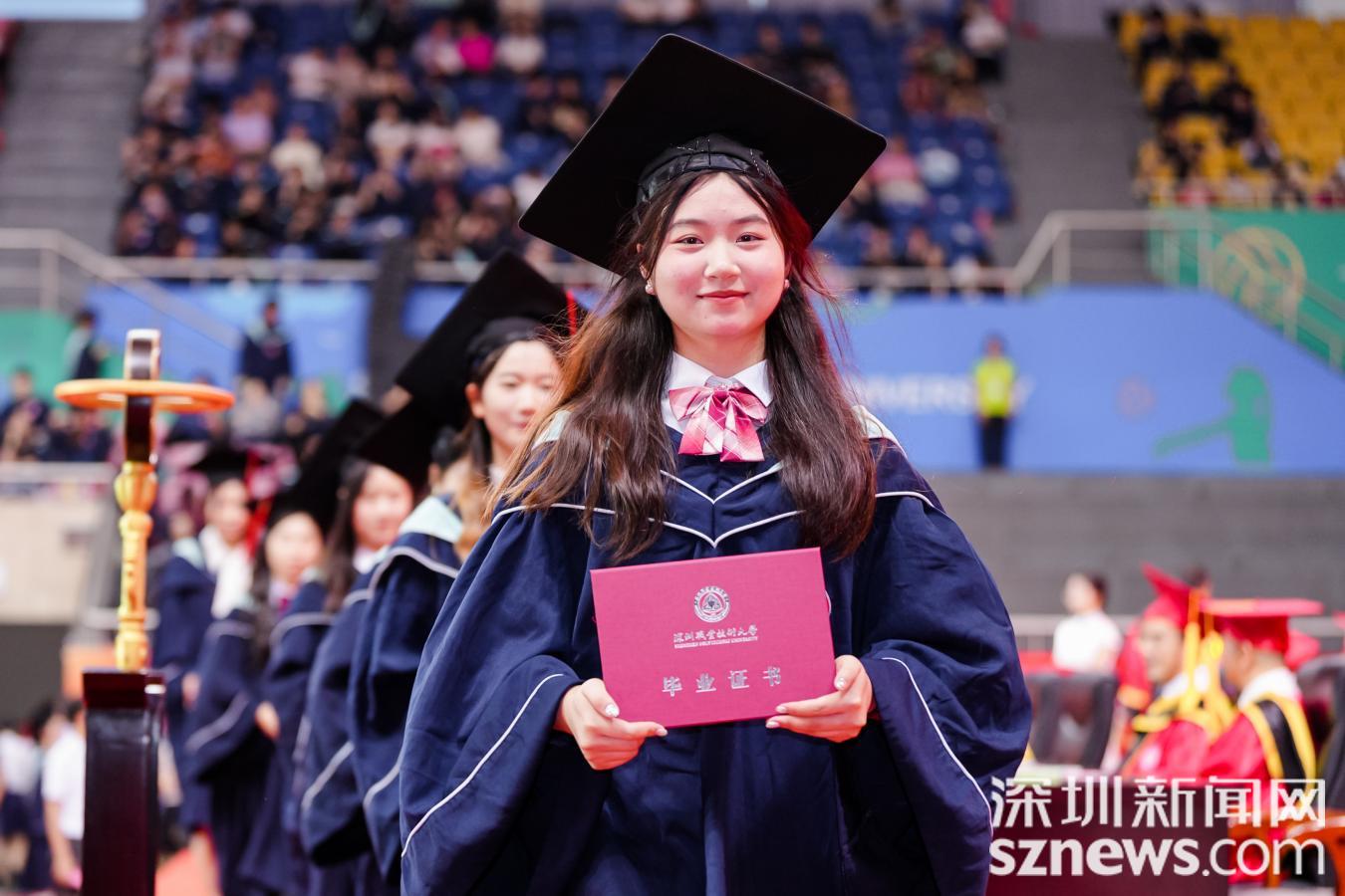毕业典礼现场通报了学校今年毕业生情况。今年,深职大共有8579名毕业生,其中,获得国家奖学金31人次,斩获世界职业院校技能大赛、国际基因工程机器大赛等国际竞赛奖牌12枚,获全国技能大赛奖项59项、省级技能大赛奖项404项,斩获2023年中国国际大学生创新大赛国赛金奖4枚,获得第十三届“挑战杯”中国大学生创业计划竞赛国赛金奖、首届全国大学生职业规划大赛全国总决赛金奖、华为ICT大赛特等奖等多个奖项。