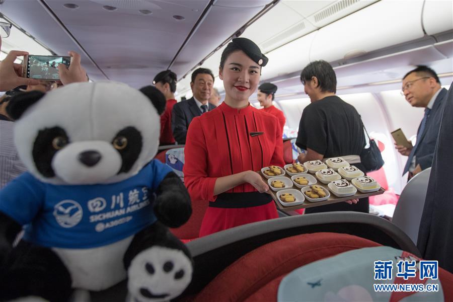 9月26日,在以色列特拉维夫本·古里安国际机场,四川航空公司空乘人员在机上展示熊猫主题的小吃。 新华社记者郭昱摄