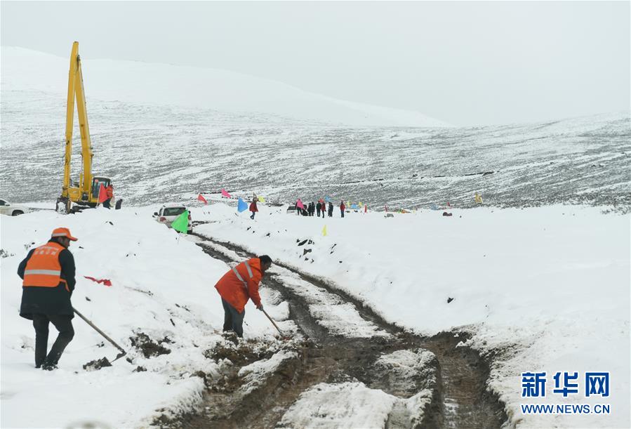 西藏道路抢通人员在西藏昌都市江达县海拔4500米左右的高山牧场上抢通道路(10月14日摄)。新华社记者刘东君摄