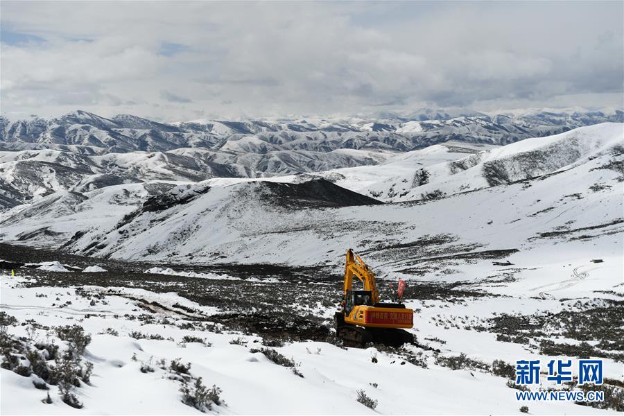 工作人员驾驶大型机械在昌都市江达县的高山牧场上抢通道路(10月14日摄)。新华社记者 刘东君 摄