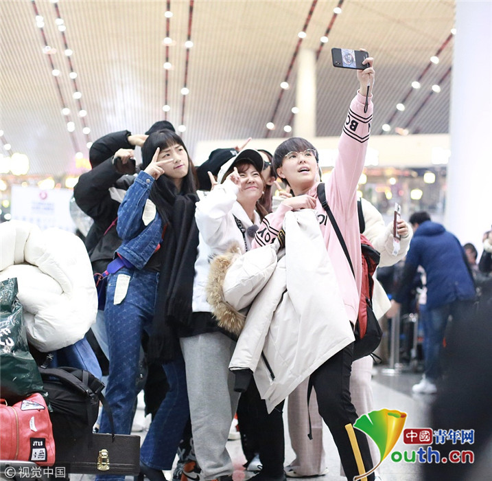 2018年12月3日,北京,“火箭少女101”全体成员现身机场前往国外录制团总综。其中孟美岐戴着墨镜,一身全黑运动装扮,大步流星气场超强,杨芸晴、yamy、杨超越等成员紧随其后,大家还一起在机场玩起自拍,好不欢乐。