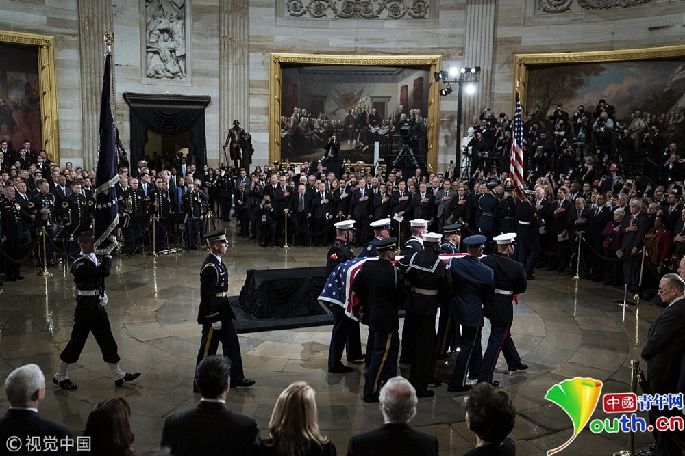 灵柩由一支军事仪仗队抬入圆形大厅,安置在1865年为林肯总统的棺材所建造的灵柩台上。
