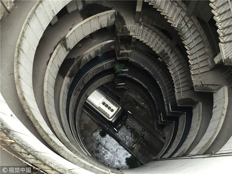 魔幻重庆再添新景观 公交车穿8层空心圆筒楼