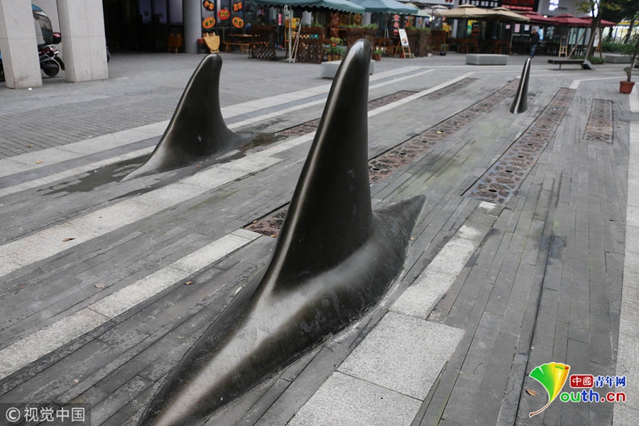 2018年11月20日,重庆一园区内马路中间突出一排“鲨鱼鳍”,司机路人都被“吓懵”了。突出的鲨鱼鳍将两侧的车行道分开,原来,这是为了进一步保证车流的有序进出和行人过街安全,同时也为了防止乱停车占用人行道,设置了这种异形“隔离桩”。图片来源:视觉中国