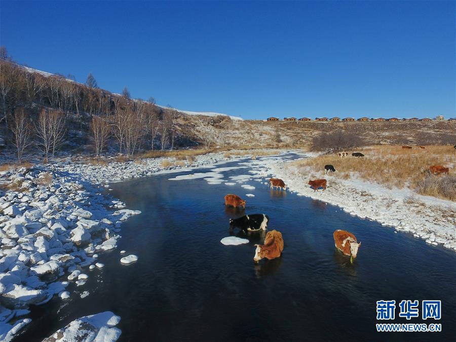 在内蒙古兴安盟阿尔山市境内,牛群在“不冻河”中饮水(12月9日无人机拍摄)。