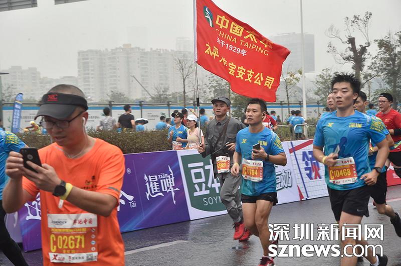 2018年12月16日,深圳国际马拉松位于后海的折返点,距离终点不远处,一位穿着八路军服装的选手正在冲刺。