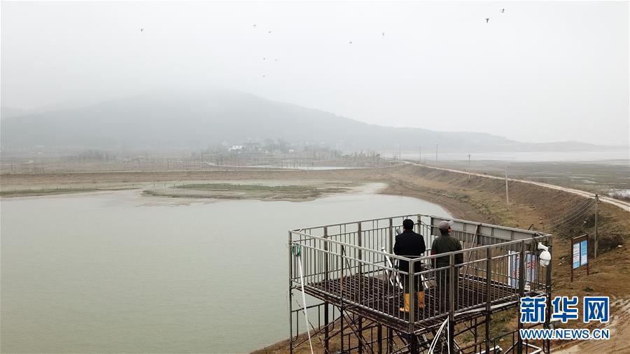 12月22日,王三益(左)在菜子湖湿地观测候鸟(无人机拍摄)。 新华社记者 张端 摄