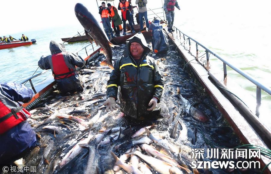 在河南省洛阳市嵩县,第三届陆浑开渔节启幕,捕捞队员们在湖心零下十几度的温度下开始捕鱼,收获新年“第一网”——超10吨鱼,现场一派鱼跃人欢的喜悦景象。