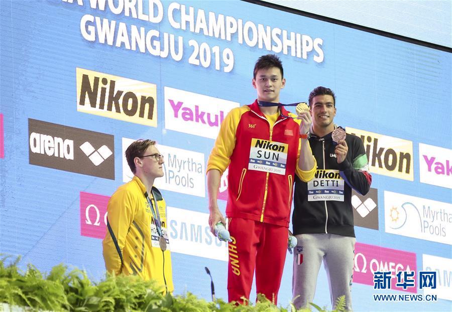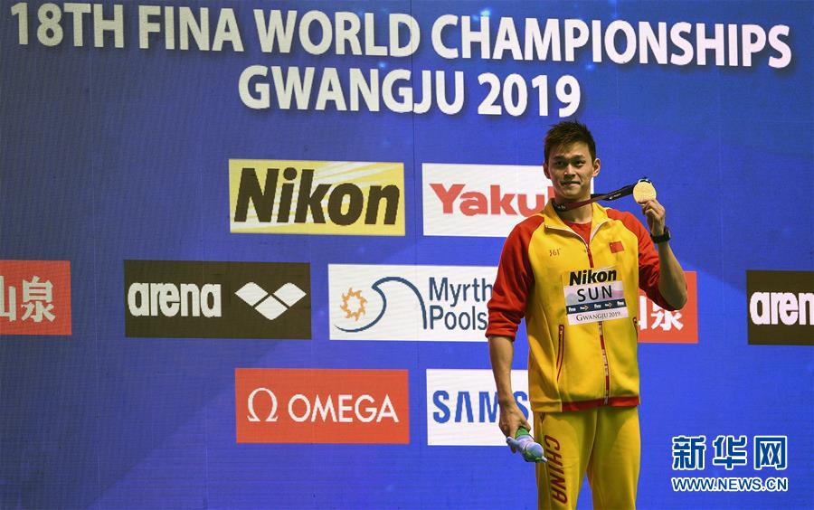 7月23日,孙杨在颁奖仪式上。当日,在韩国光州举行的2019国际泳联世界游泳锦标赛男子200米自由泳决赛中,中国选手孙杨以1分44秒93的成绩获得冠军。新华社记者夏一方摄