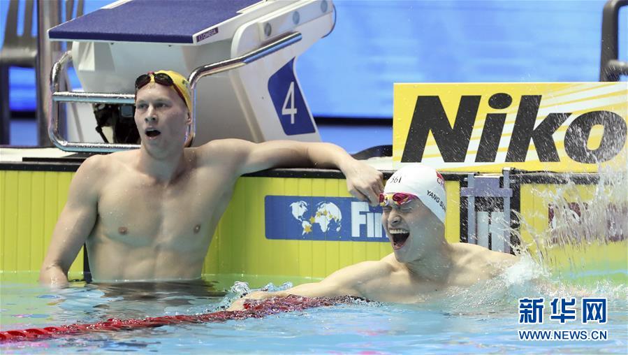 7月23日,孙杨(右)在比赛后庆祝。当日,在韩国光州举行的2019国际泳联世界游泳锦标赛男子200米自由泳决赛中,中国选手孙杨以1分44秒93的成绩获得冠军。新华社记者夏一方摄