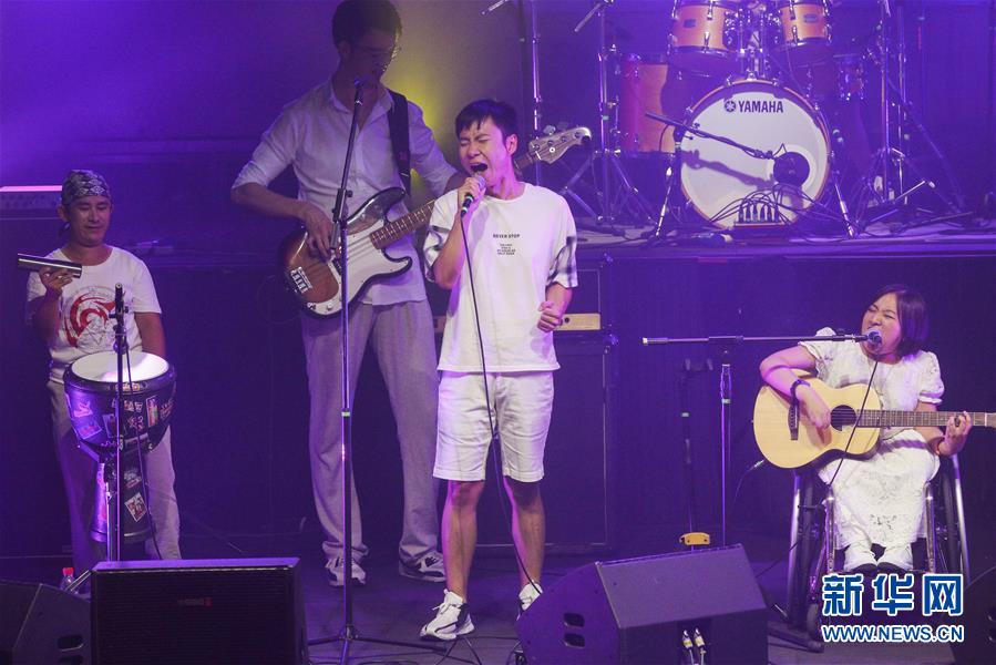 8月14日,8772乐队成员田霄(中)在演唱会上表演。新华社记者张玉薇摄