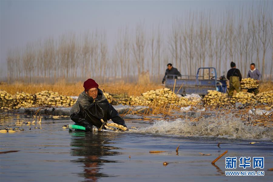 1月31日,在雄安新区安新县东向阳村的一处藕塘,一名挖藕工在水里工作。新华社记者沈伯韩摄