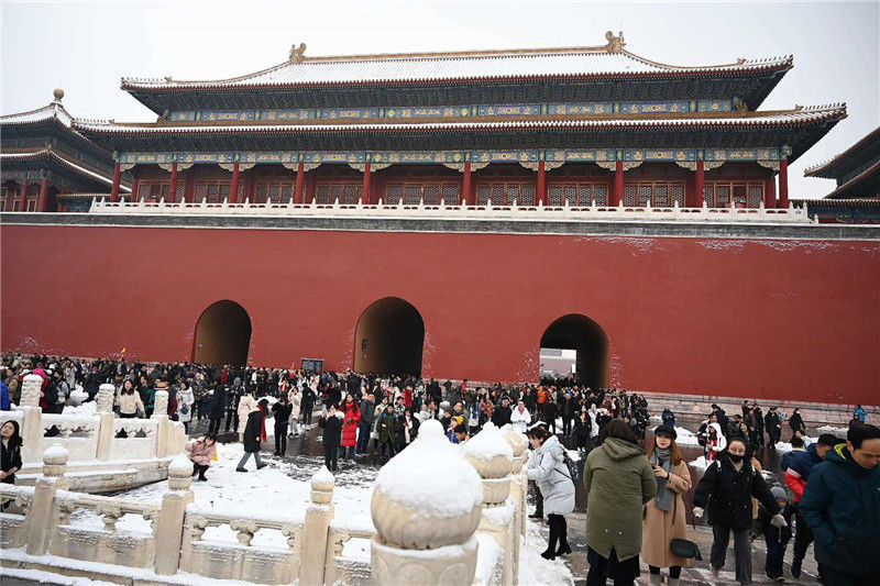 2019年11月30日,北京,一场初雪后,城市银装素裹,故宫博物院迎来今年第一批赏雪游客。
