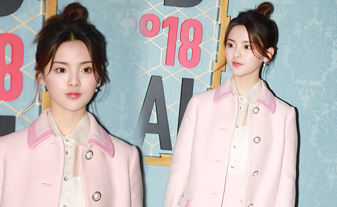 杨超越穿粉色大衣娴静优雅 扎丸子头显活泼