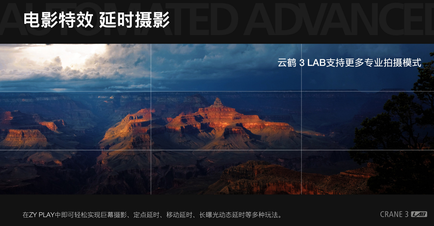 云鹤3 LAB针对延时摄影作出深度优化,探索出更多高阶玩法:静态延时、移动延时、轨迹延时、大范围延时、三轴延时、焦点延时、巨幕摄影、三维梦境,疯狗模式。