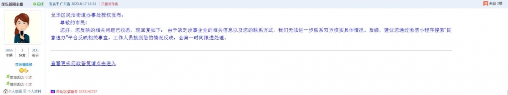 各职能单位如需对网友反映的问题进行回应,可在深圳论坛注册官方账号并通过认证,回帖进行回应,也可通过客服QQ以及热线电话,委托深圳论坛代为回应。