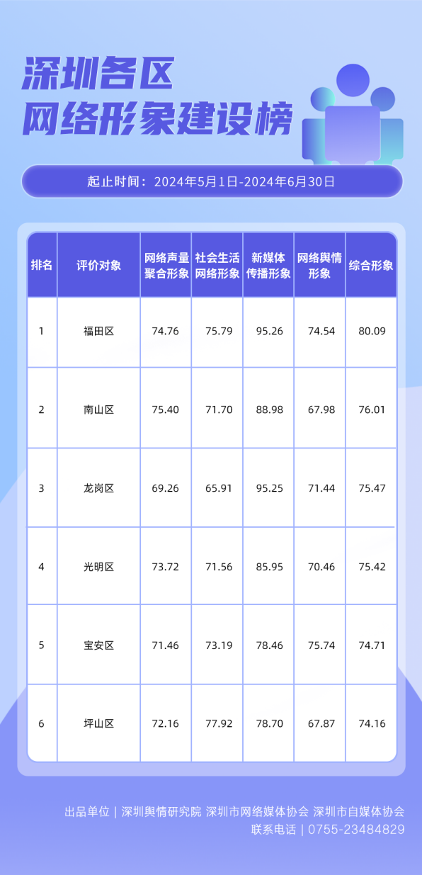 为全面评估深圳各区各单位网络形象建设情况,助力各区各单位持续响应居民对美好生活的期许,赋能城市高质量发展,深圳舆情研究院、深圳市网络媒体协会、深圳市自媒体协会联合推出“深圳各区各单位网络形象建设榜”,从网络聚合声量、留言互动成效、社会生活评价、舆情管理能力及新媒体传播水平等方面,多维度分析深圳各区(含大鹏新区、深汕特别合作区)、各市直单位(市直属单位、直属部门)的网络形象建设成果,凸显各区各单位的“共性”与“个性”。