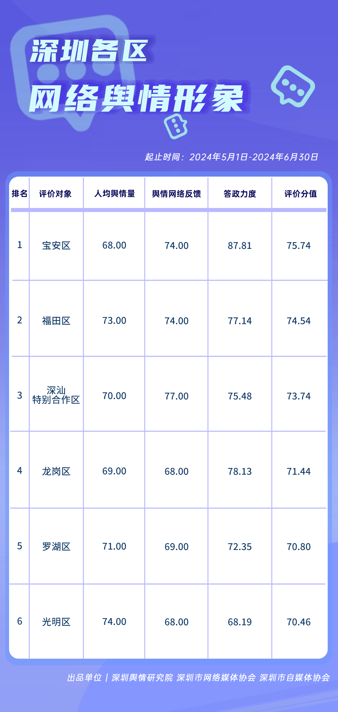 在《深圳各区网络舆情形象榜》中,宝安区以75.74分的高分荣登榜首,其在答政力度上的表现尤为突出,得分高达87.81分,这充分展现了宝安区对网络问政工作的重视程度。紧随其后的是福田区,以74.54分的评价分值位列第二。福田区在舆情处置相关的多个评价指标上均表现出色,每项指标得分均超过73分。深汕特别合作区、龙岗区、罗湖区和光明区则分别位列第三至第六名。这些区域同样展现出对民众声音的高度重视,将民意视为改进工作的重要参考,并且积极采取措施主动回应民众关切,体现了其在网络舆情管理上的积极态度和有效策略。